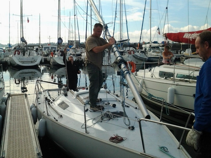 actu-2013-10-11-rematage-cqpLa promo de CQP maintenance nautique a procédé à la dernière étape du refit de Mazurka, l'un des trois Class8 de l'INB. Intégralement réaccastillé à neuf grâce au partenariat avec Seldén, et tout juste remis à l'eau, le bateau a reçu son mât.